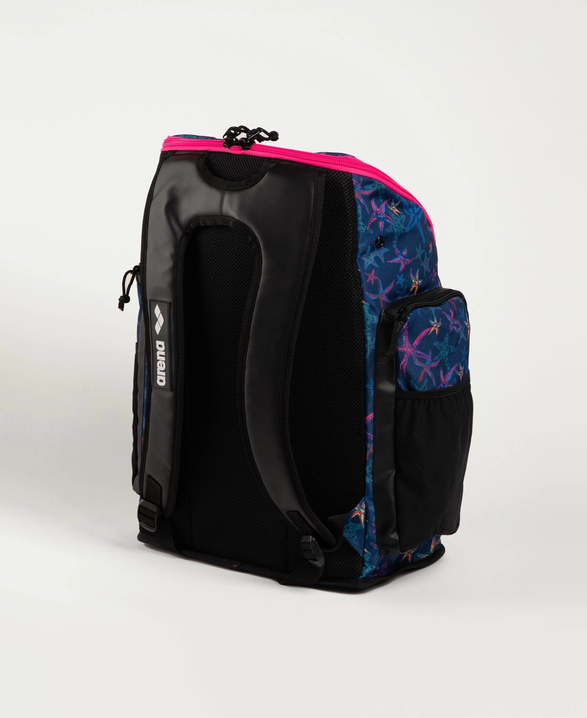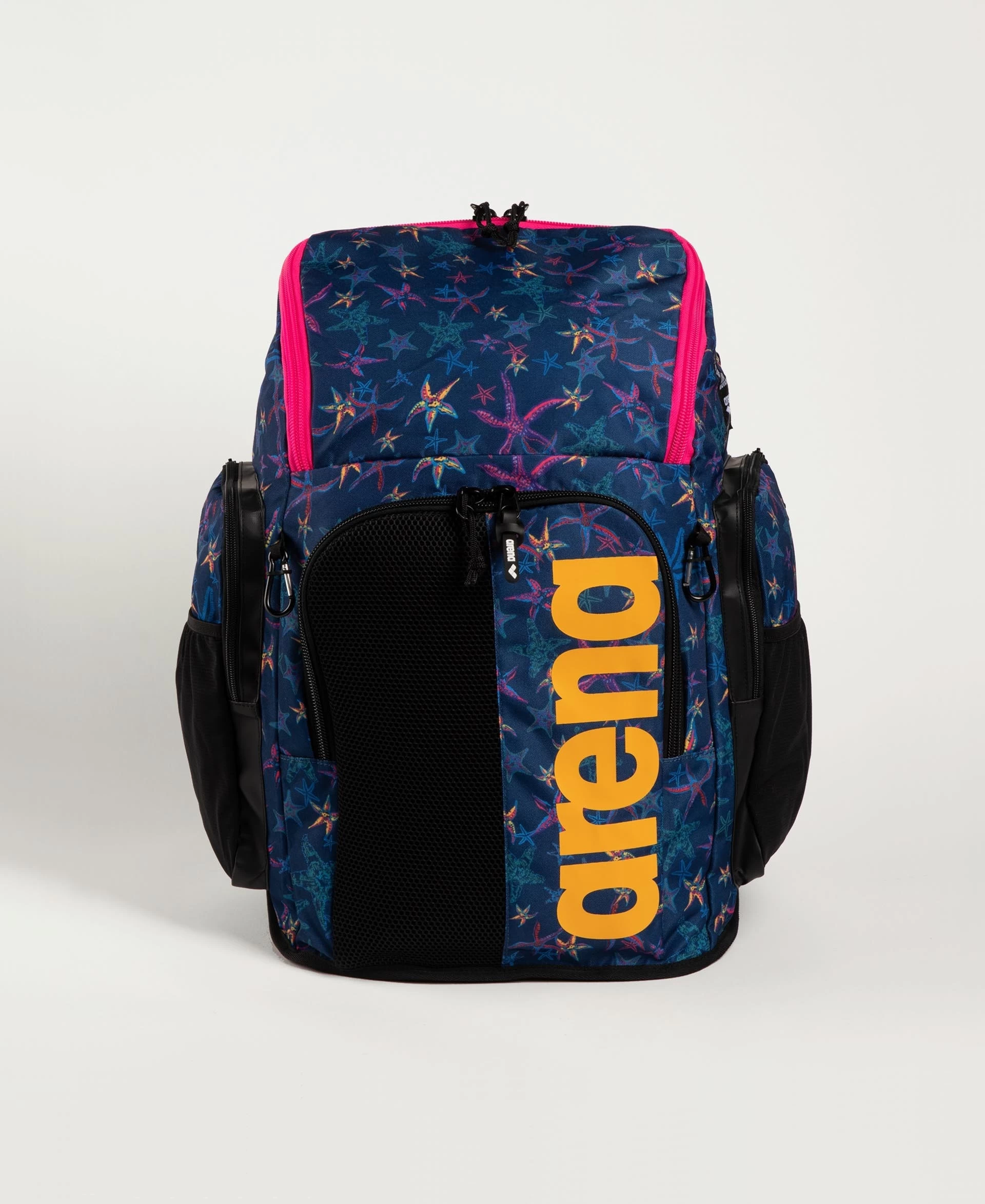The spacious, comfortable and stylish arena Spiky III Allover Backpack 45 is especially designed for swimmers. The top-loading main compartment, three zip pockets, mesh side pockets and a separate swimbag for wet garments ensure excellent storage space for all your training gear.