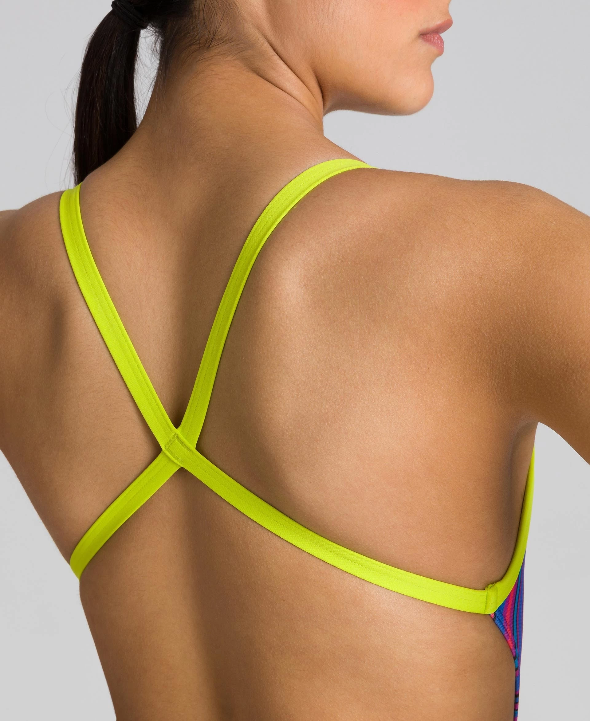 The x criss-cross silhouette maximizes support in a one piece back sporting thin straps and a cross-back configuration allowing for the highest freedom of shoulder movement.