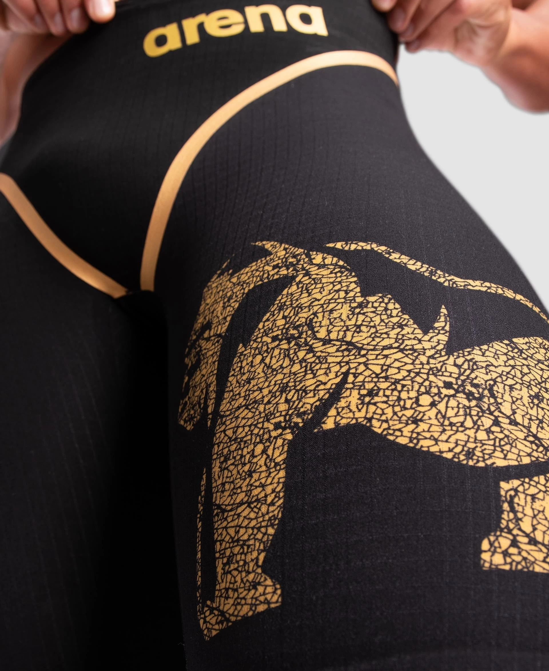 Gold medalist and 50m freestyle specialist Florent Manaudou admires how gorillas are gentle yet fiercely protective of family and friends. His personal emblem is emblazoned in gold on our limited edition Signature Gorilla Carbon-Core FX Jammers.