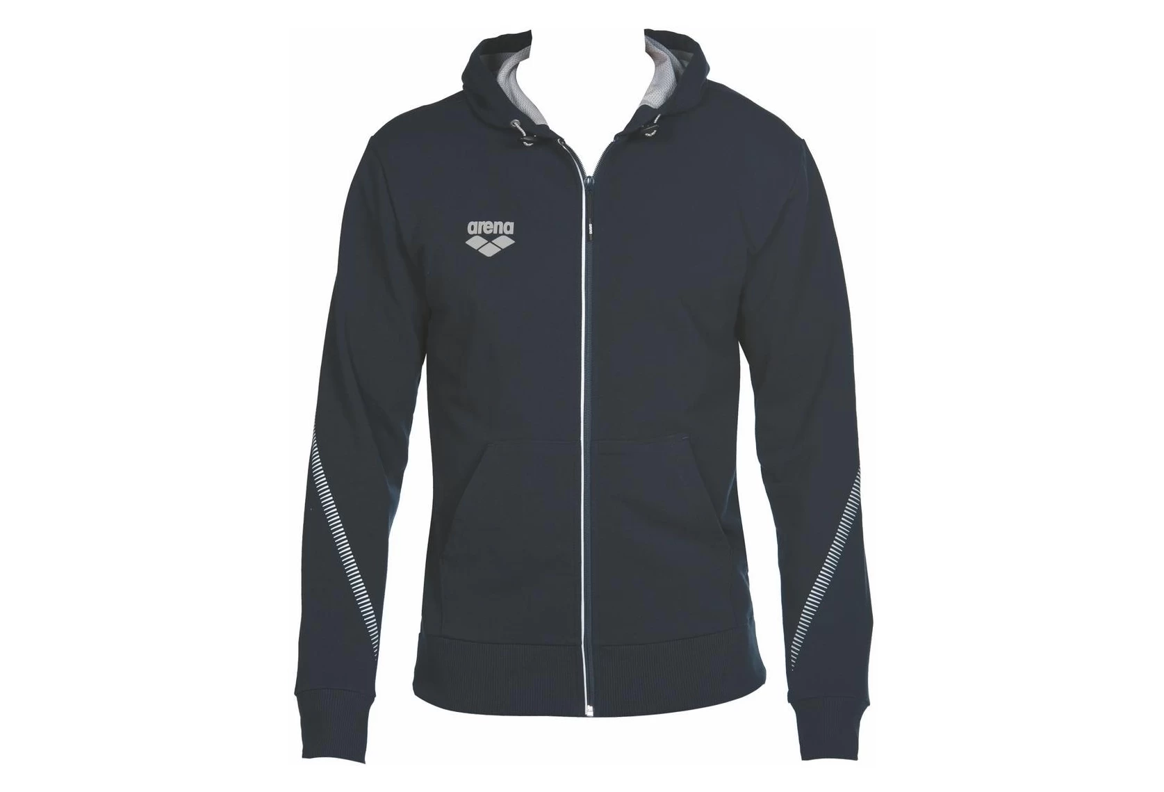 Keep your muscles warm with our soft cotton hooded jacket. Improved design with its comfortable straight cut, two very useful pockets and contrasting sleeves. This sweatshirt also has an adjustable hood with its drawstring, a solid zipper surrounded by reflective trims and our logo. Perfect for enhancing your appearance at sporting or aquatic events.