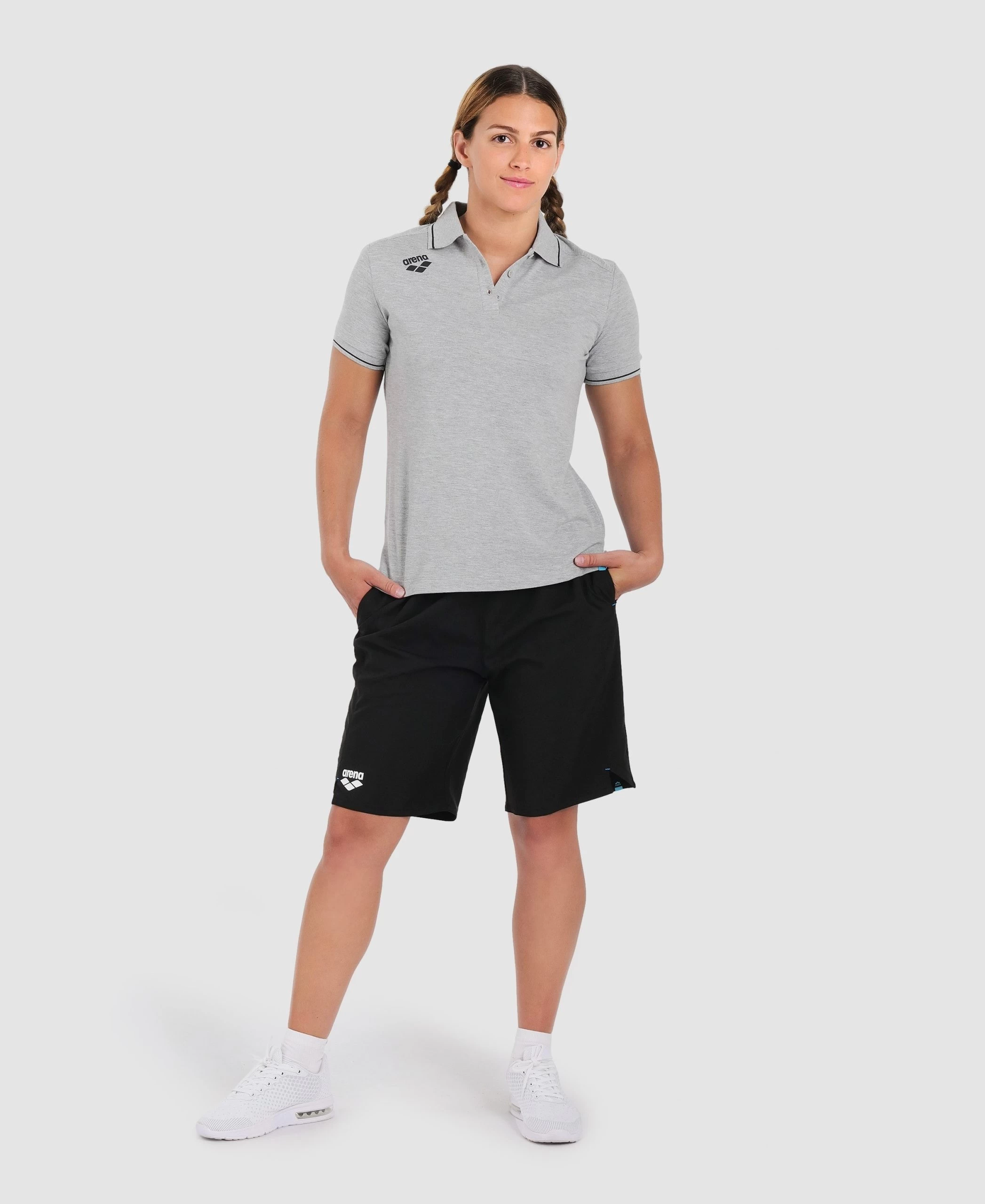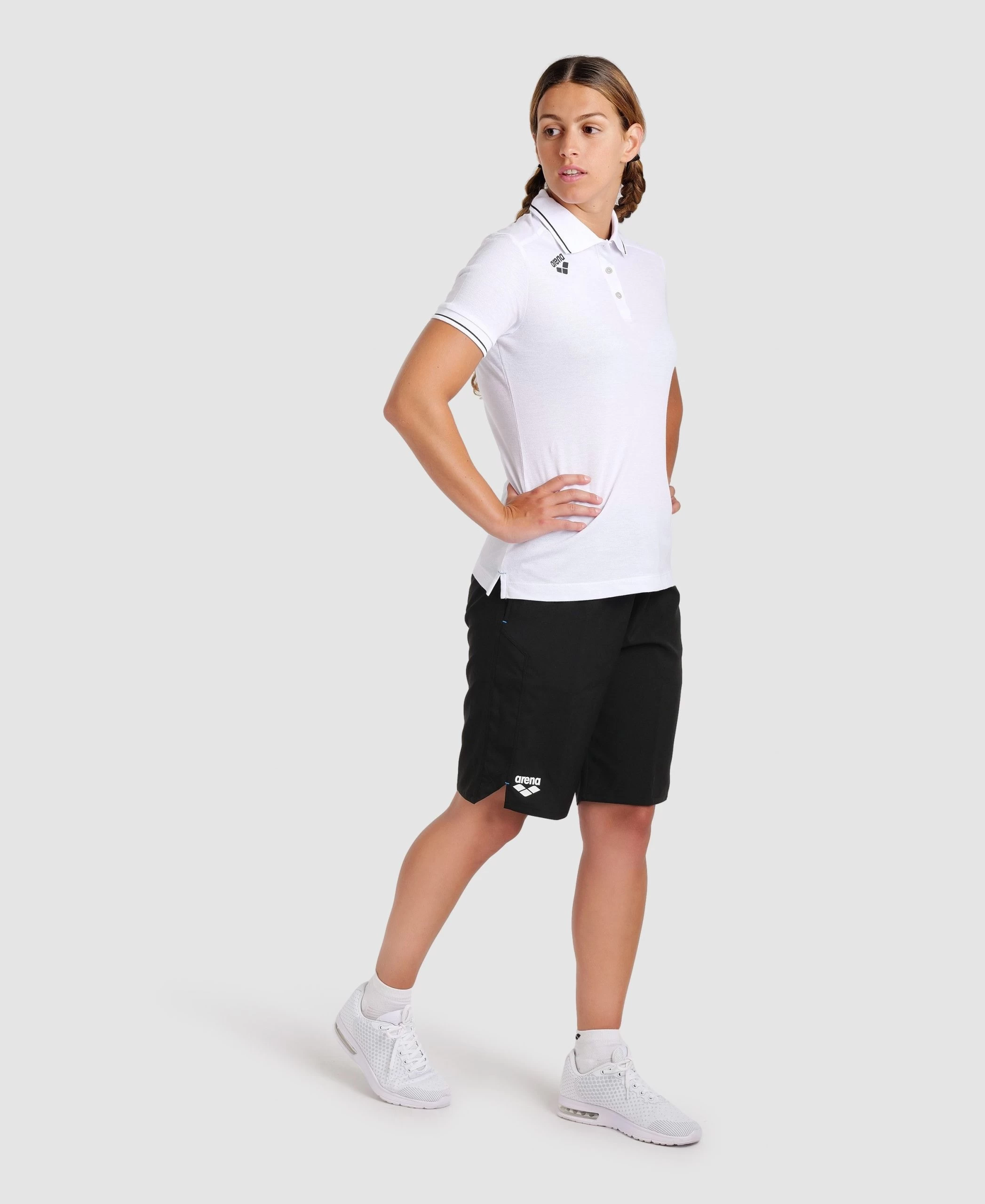 Polished and professional, the arena Team Women’s Solid Cotton Polo Shirt is perfect for athletic training and casual wear. Crafted from a soft cotton fabric for excellent comfort, it has a three-button fastening, short sleeves and tailored construction for a feminine fit. Finished with contrasting trim on the sleeves and collar and the arena logo.