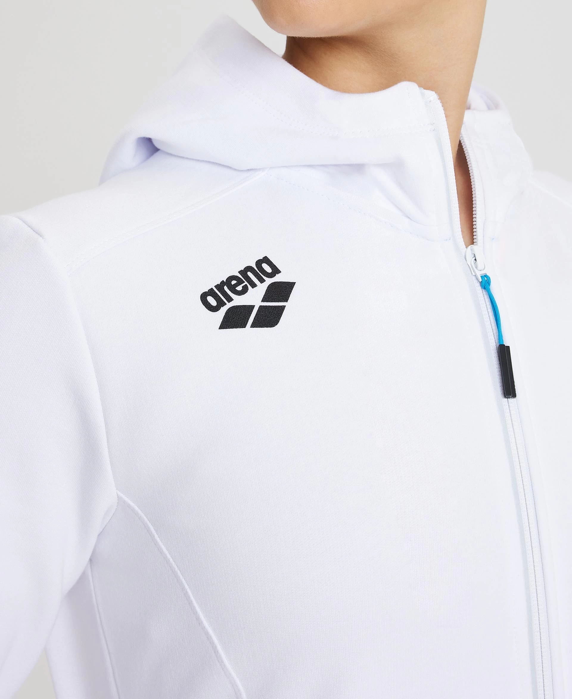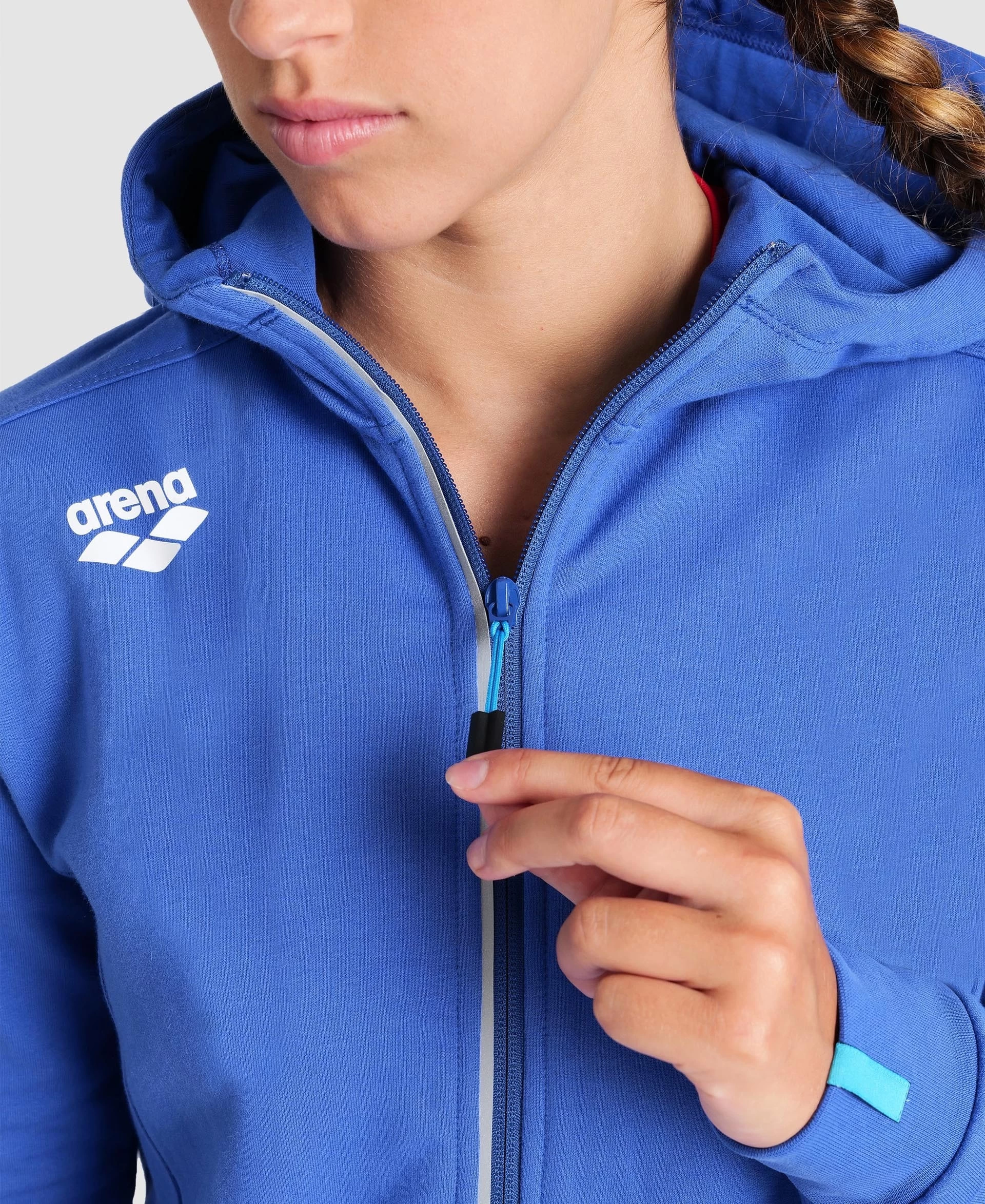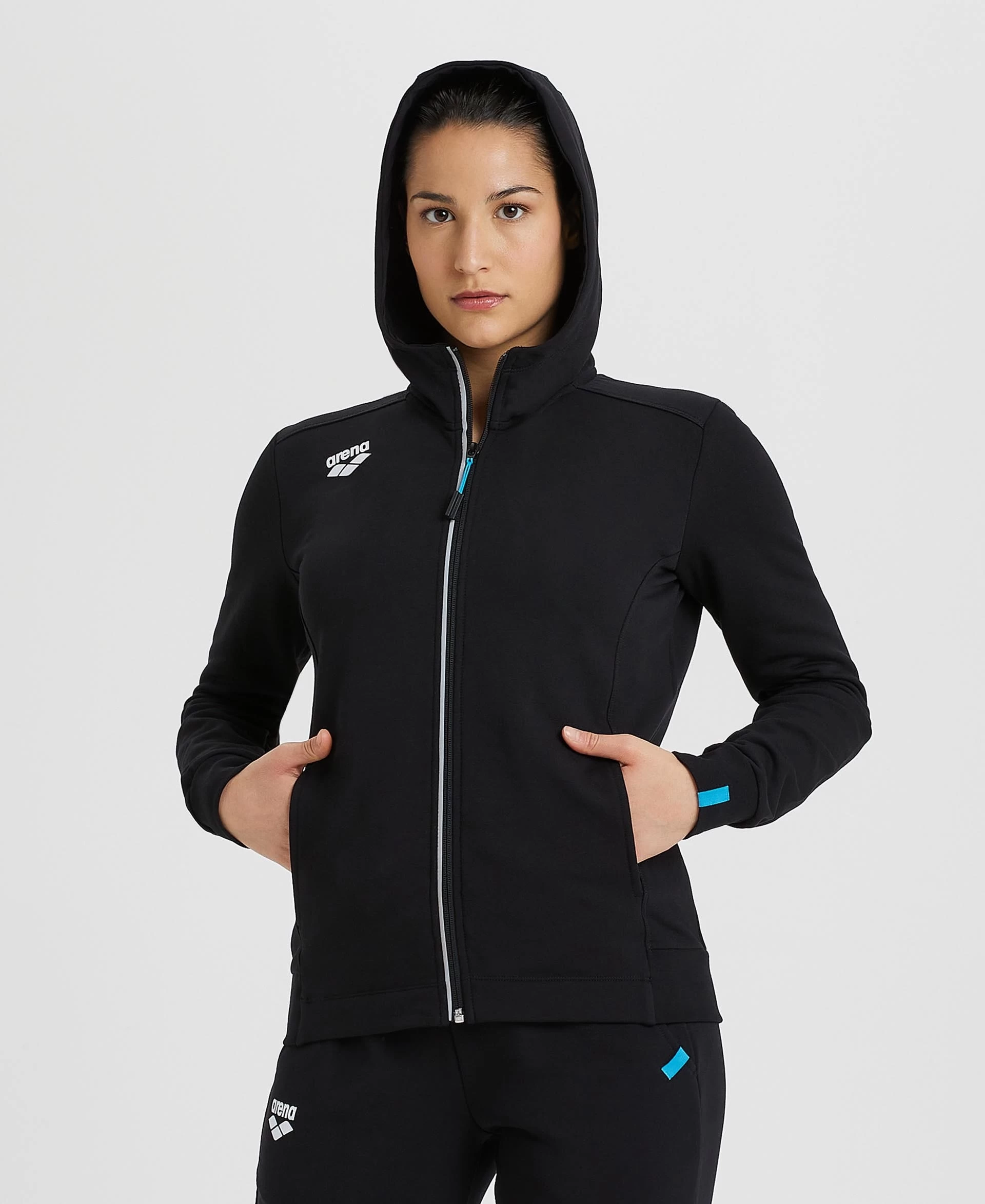 The arena Team Women’s Hooded Panel Jacket is perfect for sports and casual wear. This athletic outer layer is made from a stretch cotton fleece for comfort and easy movement. It has contouring seams for a feminine fit, two inseam pockets, a hood and logo detailing. Reflective tape along the zipper improves visibility in low light. Wear it with arena pants and shirts for a coordinated look.