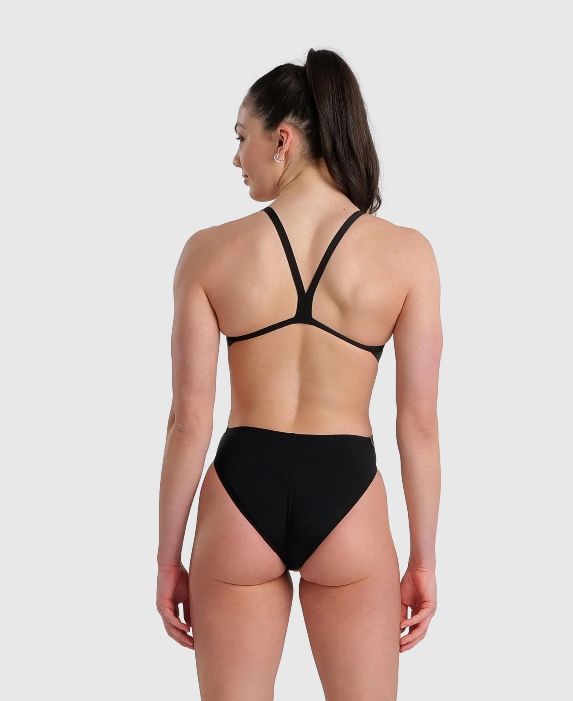 Wide back opening with narrow straps designed to keep your shoulder blades free to move.